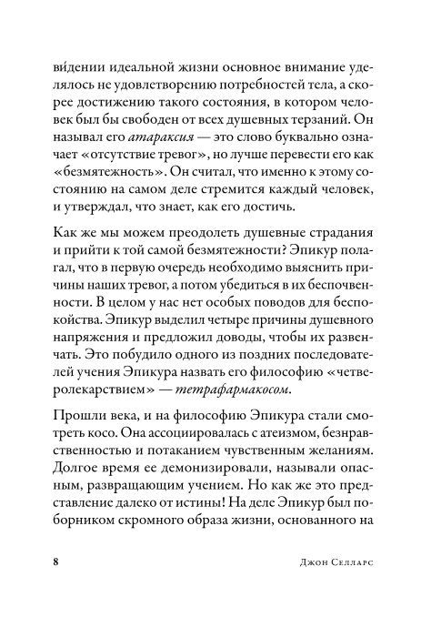 История не была добра к древнегреческому философу Эпикуру: мало кого из мыслителей так превратно понимали потомки. Уже много веков эпикурейцами называют обжор, гедонистов, любителей пожить в свое удовольствие - и все из-за того, что высшим благом в жизни философ считал наслаждение. Но в чем на самом деле состояло наслаждение для Эпикура, призывавшего довольствоваться малым и показывавшего своим ученикам путь к духовной безмятежности? Книга английского философа Джона Селларса правдиво и просто рассказывает о тетрафармакосе - эпикурейском учении, исцеляющем от тревог и страхов и основанном на атомистической теории.