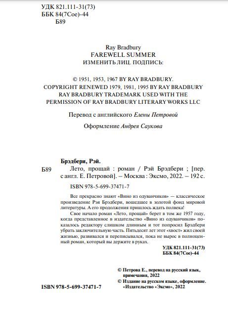 На самом деле роман "Лето, прощай" берет свое начало все в том же 1957 году, когда представленное в издательство "Вино из одуванчиков" показалось редактору слишком длинным и тот попросил Брэдбери убрать заключительную часть. За прошедшие пятьдесят лет этот "хвост" жил своей жизнью, развивался и переписывался, пока не вырос в полноценный роман, который и предлагается вашему вниманию.