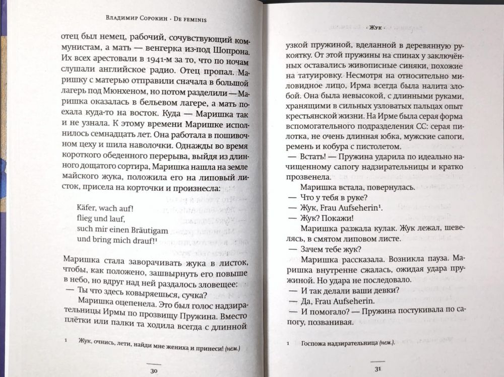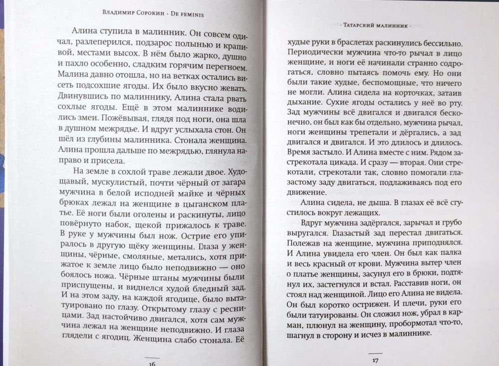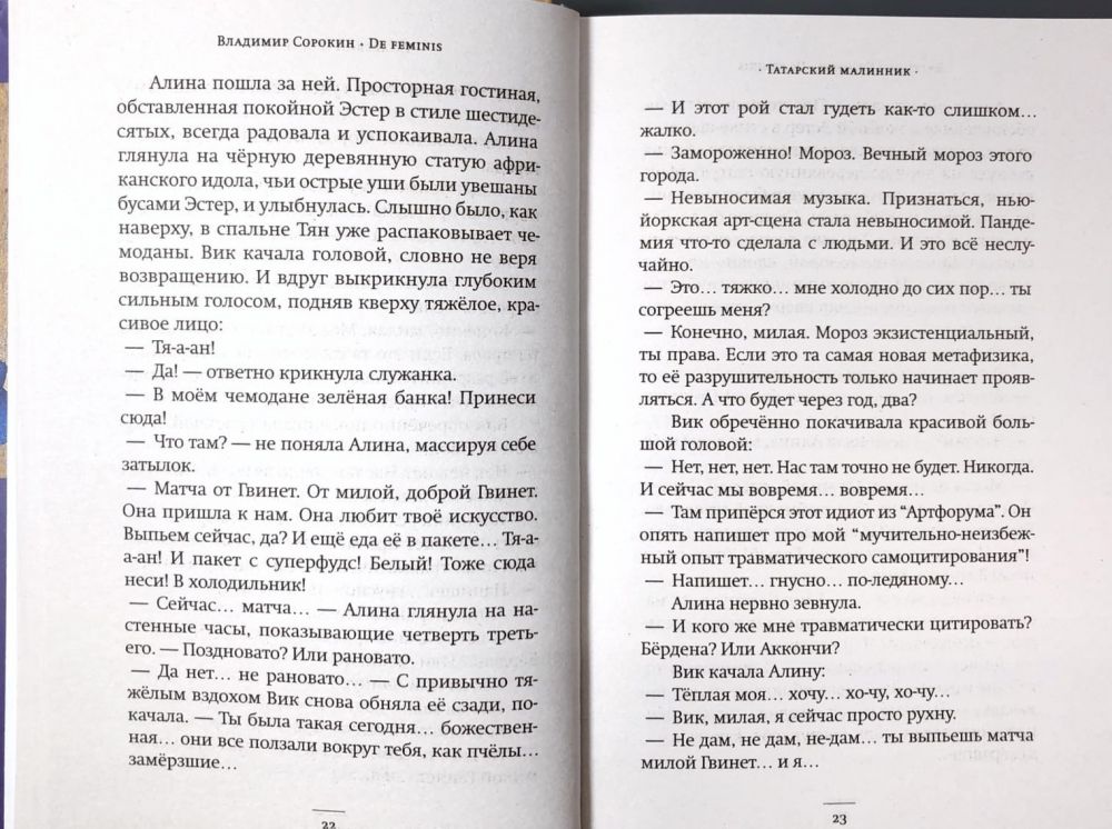 Сорокин остается собой – выстраивает карнавальные антиутопии, жонглирует цитатами из канонической русской литературы и овеществляет метафоры – и в то же время продолжает двигаться в новом направлении. Все большее сочувствие к свидетелям и невольным участникам великих геополитических драм, повествовательность и лиризм, заданные «Метелью» и продолженные в «Докторе Гарине», в «De feminis» особенно заметны.