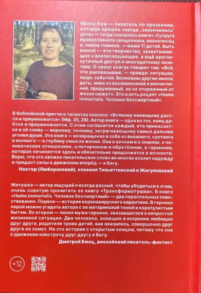 Новая книга Ирины Ким «Человек бессмертный. Homo immortalis» рассказывает о том, как жизненные перипетии приводят главную героиню с малолетними детьми к вынужденной изоляции — карантину в обсерваторе. Ее муж в это же время изолирует себя добровольно, уходит в глухой лес, услышав от врачей смертельный диагноз. Оказавшись перед лицом серьезных испытаний, оба ищут ответ на вопрос: за что им это послано? Внимательного читателя ждет развязка, приоткрывающая тайну евангельских строк: «Так будут последние первыми, и первые последними, ибо много званых, а мало избранных» (Мф. 20,16).