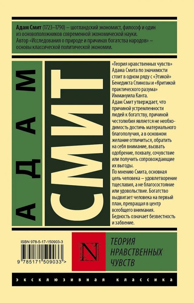 Адам Смит (1723-1790) – шотландский экономист, философ и один из основоположников современной экономической науки. Автор "Исследования о природе и причинах богатства народов" – основы классической политической экономии."Теория нравственных чувств" Адама Смита по значимости стоит в одном ряду с "Этикой" Бенедикта Спинозы и "Критикой практического разума" Иммануила Канта.Адам Смит утверждает, что причиной устремленности людей к богатству, причиной честолюбия является не необходимость достичь материального благополучия, а в основном желание отличиться, обратить на себя внимание, вызвать одобрение, похвалу, сочувствие или получить сопровождающие их выгоды. По мнению Смита, основная цель человека - удовлетворение тщеславия, а не благосостояние или удовольствие. Богатство выдвигает человека на первый план, превращая в центр всеобщего внимания. Бедность означает безвестность и забвение.