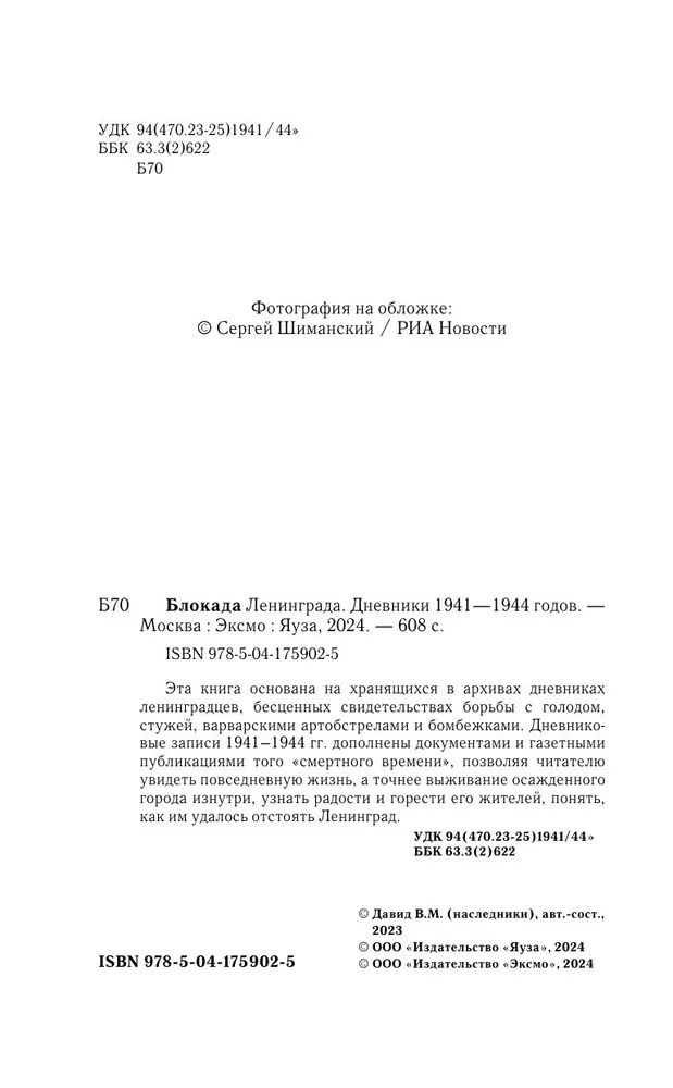 Блокада Ленинграда стала одной из самых трагических страниц Великой Отечественной войны. Пройдя через тяжелейшие испытания, жители города на Неве показали невиданные в мировой истории примеры мужества и стойкости. Эта книга основана на хранящихся в архивах дневниках ленинградцев, бесценных свидетельствах борьбы с голодом, стужей, варварскими артобстрелами и бомбежками. Авторы дневников – директор завода, инженеры, рабочие, школьницы, студентка, домохозяйка, главврач поликлиники, служащий горкома, работник железной дороги, сотрудник радиоузла, преподаватель музыкальной школы, контролер по учету и выдаче продовольственных карточек. В этом издании дневниковые записи 1941–1944 годов дополнены документами и газетными публикациями того «смертного времени», позволяя читателю увидеть повседневную жизнь, а точнее выживание осажденного города изнутри, узнать радости и горести его жителей, понять, как им удалось отстоять Ленинград.
