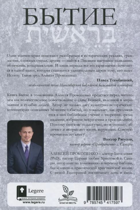 Книга Бытие в толковании Алексея Прокопенко предстает перед читателем как величественное повествование о славе Божьей, явленной в мироздании и судьбах людей. Автор не только дает культурно-исторические комментарии описанных Моисеем событий, но показывает, как преломляется в них библейское учение о творении, грехопадении, избрании, искуплении и прославлении. Поэтому книга не только учит,