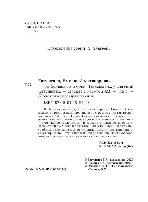 В сборник «Ты большая в любви. Ты смелая...» вошли избранные стихотворения поэта, в которых отражается таинственная жизнь души, жаждущей свободы и творчества. Книга поможет читателю не только погрузиться в захватывающие лирические миры Евгения Евтушенко, но и найти собственные жизненные пути, следуя за поэтическим словом как за путеводной звездой.