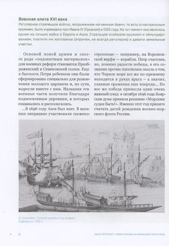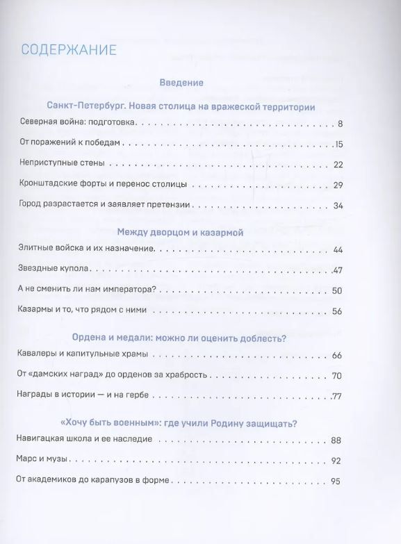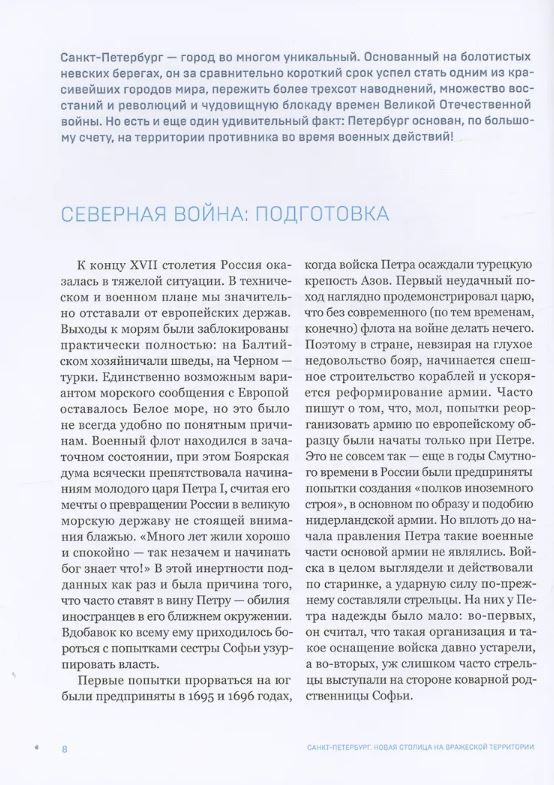 С помощью обилия красочных иллюстраций и исторических фактов эта книга подробно рассказывает как о событиях Северной войны, так и о крепостях, построенных в ходе тех событий. Она поднимает вопросы о причинах, породивших эпоху дворцовых переворотов, и ее последствиях. Освещает события обеих революций 1917 года и повествует о дальнейшей судьбе города. И, конечно же, широко и подробно раскрывает тему блокады Ленинграда.