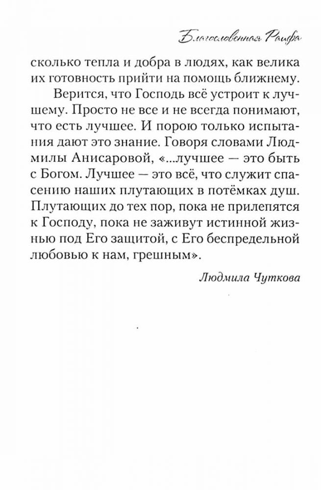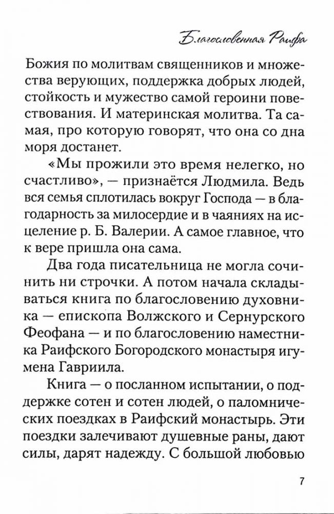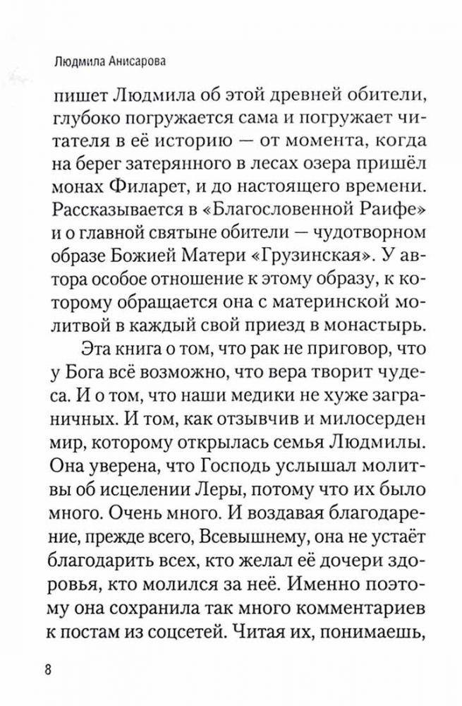 Это - книга-исповедь. Как всякая исповедь, она откровенна. Как всякая исповедь, она полна надежды. Автор рассказывает о посланном её семье испытании, об обретении и укреплении веры, о паломнических поездках в Раифский монастырь, погружая читателя в историю обители и её главной святыни — чудотворного образа Божией Матери «Грузинская». Эта книга о том, что никогда нельзя отчаиваться, что даже самый страшный диагноз не приговор, ибо у Бога всё возможно. Главное — открыть своё сердце для Его безграничной любви и полностью довериться Его святой воле.