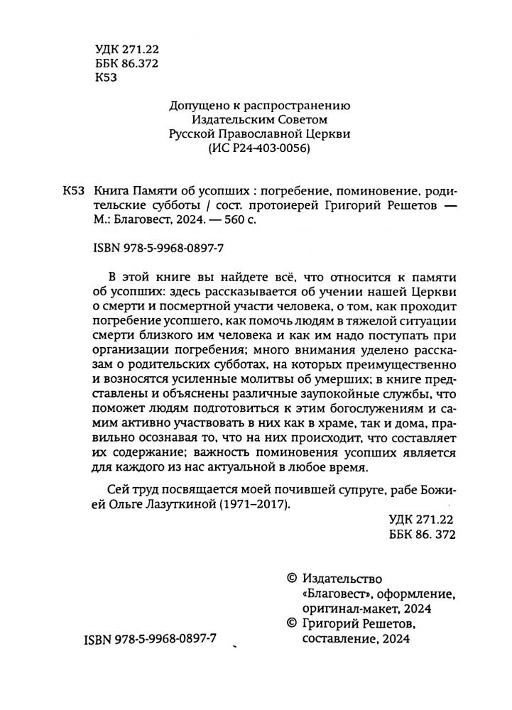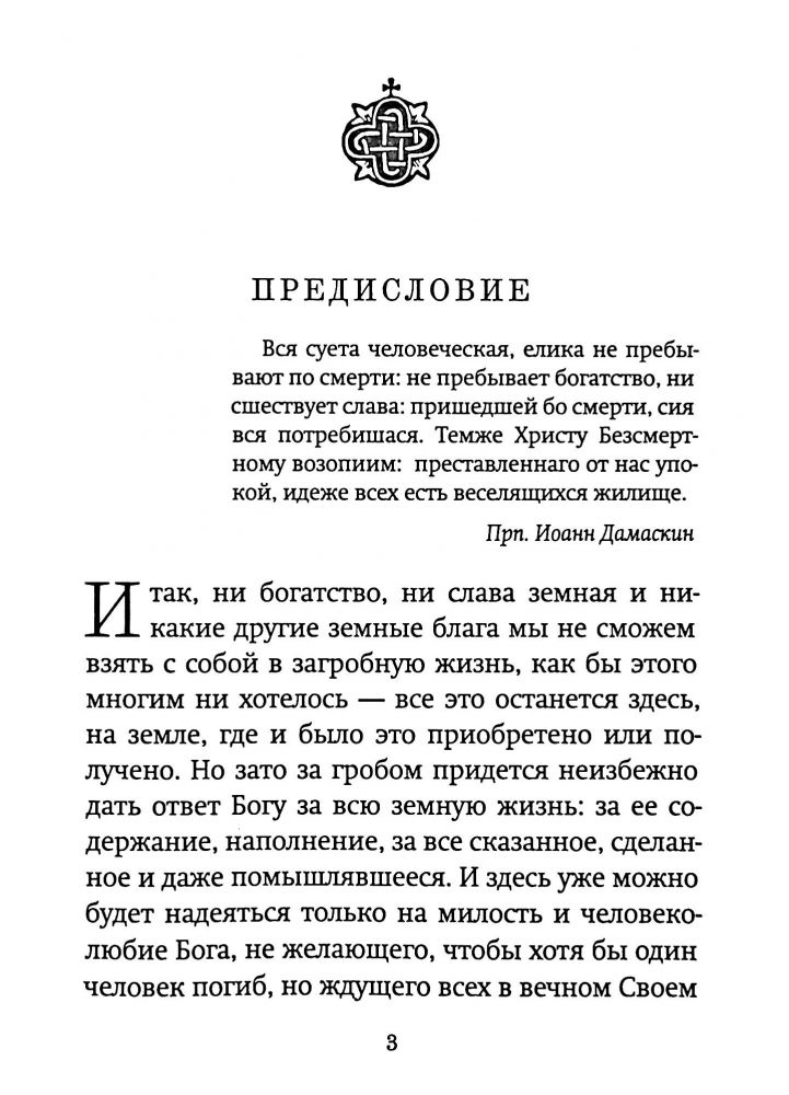 В этой книге вы найдете всё, что относится к памяти об усопших: здесь рассказывается об учении нашей Церкви, о смерти и посмертной участи человека, о том, как проходит погребение усопшего, как помочь людям в тяжелой ситуации смерти близкого им человека, и как им надо поступать при организации погребения. Много внимания уделено рассказам о родительских субботах, на которых преимущественно и возносятся усиленные молитвы о об умерших.