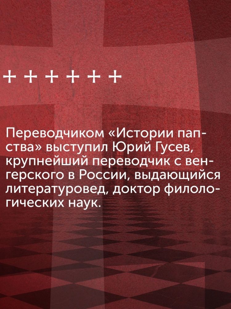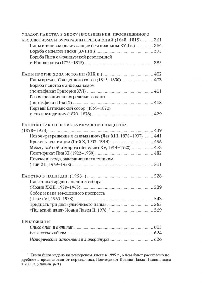 Книга рассчитана на широкого читателя и охватывает 20 веков истории папской духовной власти и церковного государства от апостола Петра до Иоанна-Павла II. Гонения на первых христиан, борьба за инвеституру с германскими императорами, крестовые походы, авиньонское пленение, продажа индульгенций, Реформация и Контрреформация, религиозные войны – все победы и поражения, реформы, интриги, знаменитые буллы и Соборы, святые и грешники на папском престоле, всё это вы найдете в увлекательной и достоверной книге Енё Гергея.