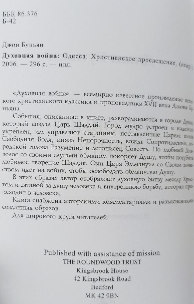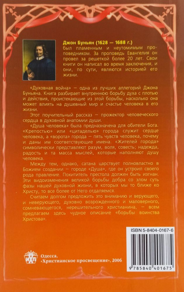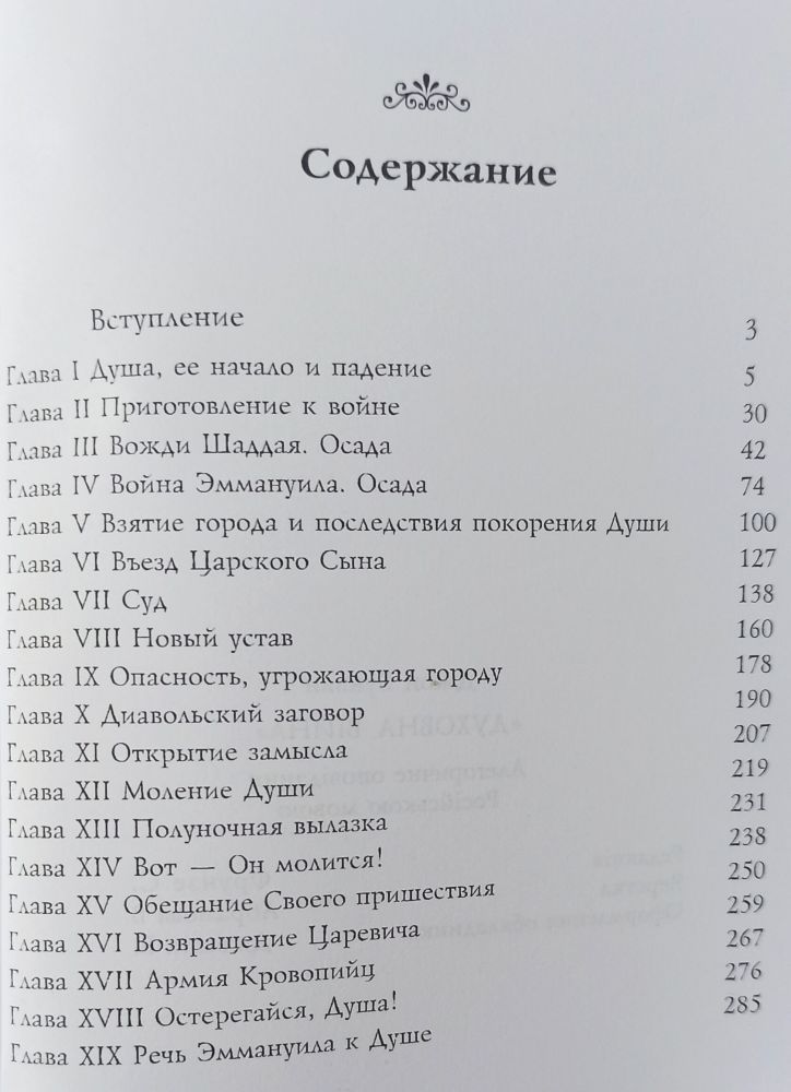 События, описанные в книге, разворачиваются в городе Душа, который Создал Царь Шаддай. Город мудро устроен и надежно укреплен, им управляют старшины, поставленные Царем: князь Свободная Воля, князь Непорочность, вождь Сопротивление, городской голова Разумение и летописец Совесть. Но злобный Диаволос со своими слугами обманом покоряет Душу, чтобы погубить любимое творение Шаддая. Сын Царя Эммануил со Своим воинством идет на войну, чтобы освободить обманутую Душу. В этих образах автор отображает духовную битву между Христом и сатаной за душу человека и внутреннюю борьбу, которая происходит в человеке. Книга снабжена авторскими комментариями и разъяснениями созданных образов.