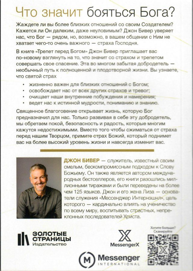 В книге «Трепет перед Богом» Джон Бивер приглашает вас по-новому взглянуть на то, что значит со страхом и трепетом совершать свое спасение. Эта во многом забытая добродетель — необычный путь к полноценной и плодотворной жизни. Вы узнаете, что святой страх