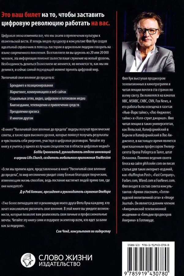 Это ваш билет на то, чтобы заставить цифровую революцию работать на вас. Цифровая эпоха изменила все, что мы знаем о привлечении культуры к евангельской вести. И теперь медиа-продюсер и консультант Фил Кук создал идеальный справочник в помощь пасторам и церковным лидерам говорить на языке современного поколения. Возглавляете ли вы церковь из 20 или 20 000 человек, эта информация поможет вывести ваше служение на новый уровень. Необходимость делиться Евангелием не меняется, но меняется то, как мы им делимся, и сейчас самый подходящий момент принять цифровой мир.