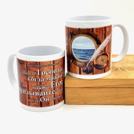 Кружка: "Ищите Господа, когда можно найти Его; призывайте Его, когда Он близко" Ис 55:6 Размер: 95 мм. высота, диаметр 80 мм. Белая внутри