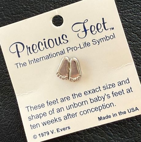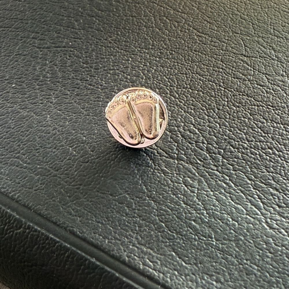 Значок металлический "Пяточки". Оригинальный размер стопы 10-ти недельного ребенка, Цвет "серебро", размер 10 х 10 мм.