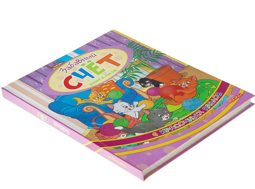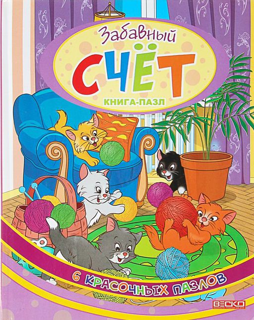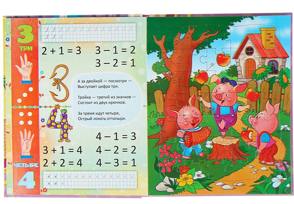 В книжке представлены яркие, красочные картинки-пазлы, а также стихи и маленькие примеры для обучения счета.