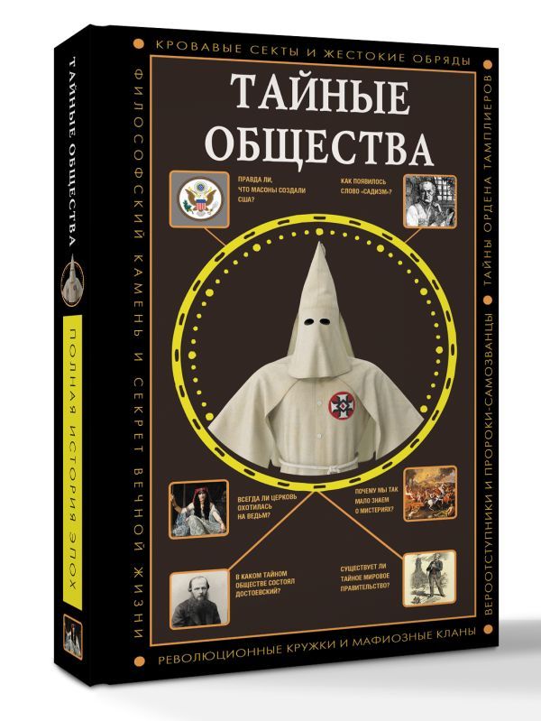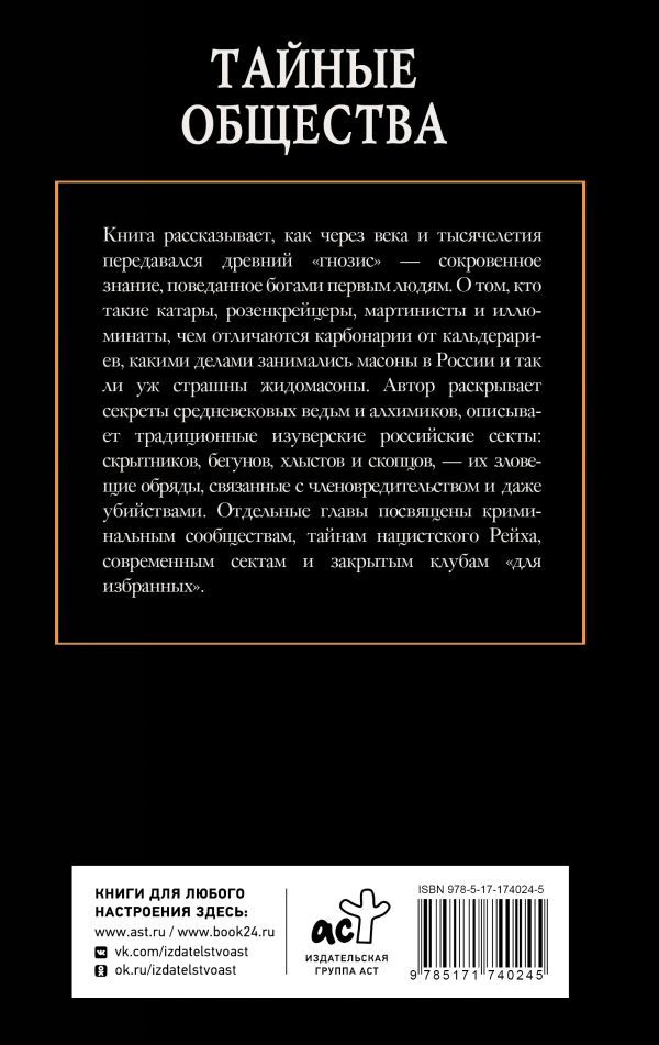 Книга рассказывает, как через века и тысячелетия передавался древний "гнозис" — сокровенное знание, поведанное богами первым людям. О том, кто такие катары, розенкрейцеры, мартинисты и иллюминаты; чем отличаются карбонарии от кальдерариев; какими делами занимались масоны в России и так ли уж страшны жидомасоны. Автор раскрывает секреты средневековых ведьм и алхимиков, описывает традиционные изуверские российские секты: скрытников, бегунов, хлыстов и скопцов; их зловещие обряды, связанные с членовредительством и даже убийствами. Отдельные главы посвящены криминальным сообществам, тайнам нацистского Рейха, современным сектам и закрытым клубам "для избранных".
