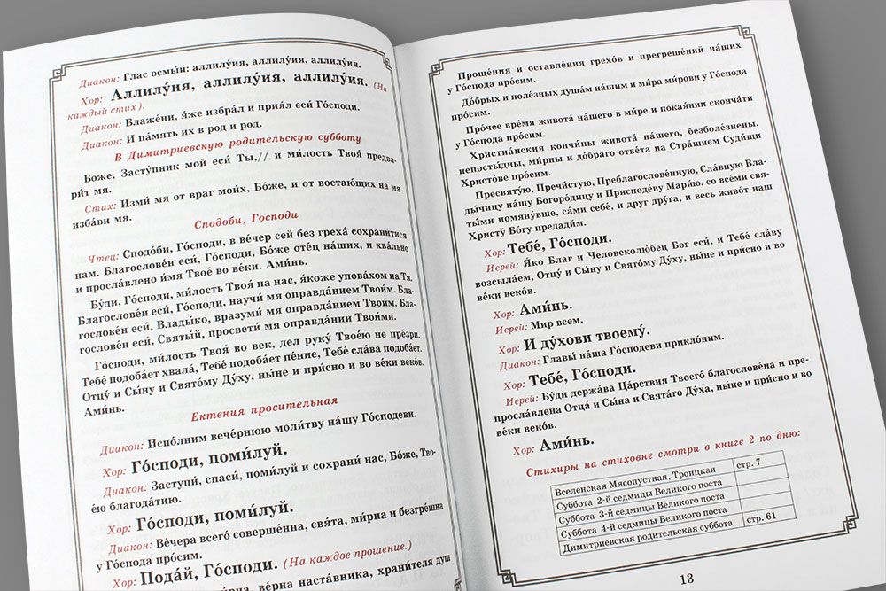 Двухцветная печать, традиционная для богослужебных изданий, облегчает визуальное восприятие. Неизменяемые нотные песнопения и текст чтеца набраны средним шрифтом, а изменяемые песнопения — укрупненным, с ударениями и разметкой для пения.