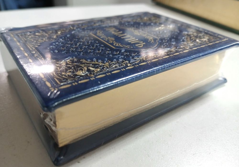 Псалтирь выполнена в компактном формате с трехсторонним золочением обрезов; искусно изготовленный переплет ручной работы украшен изящным тиснением.