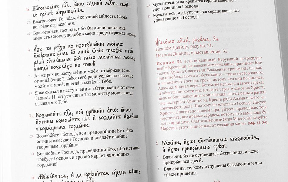 Предлагаемое издание содержит церковнославянскую Псалтирь, напечатанную в полном соответствии с синодальными текстами. Эта книга поможет тем, кто хочет лучше понять смысл Псалтири и научиться читать на церковнославянском языке, так как включает его транскрипцию — то есть передает через современную русскую орфографию элементы звучащей речи. Псалмы печатаются с переводом на русский язык, выполненным с церковнославянского языка Е. Н. Бируковой и И. Н. Бируковым в 1975–1985 гг. Переводчики стремились не только помочь нашим современникам проникнуть в духовный смысл Псалтири, но и создать перевод, максимально близкий к ритму и интонациям славянского текста, его образам и эпитетам. Каждый псалом снабжен кратким пояснением на основе описания псалмов архимандрита Наума (Байбородина), одного из наиболее почитаемых старцев Русской Православной Церкви последней четверти XX — начала XXI вв.