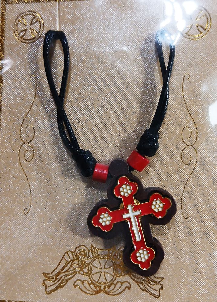 Крест нательный в деревянной оправе с эмалью, на гайтане.