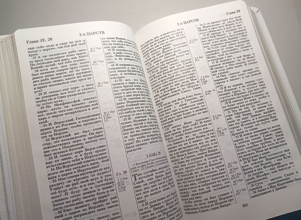 Подарочная Библия формата 143Х220 мм в гибком переплёте с золотым обрезом. В издание входят только канонические книги (В Ветхом Завете - 39 книг, всего в Библии - 66 книг). Перевод Синодальный 1876 г., в традиционной редакции в новой орфографии. Вёрстка - стандартная для канонических Библий - в две колонки, со ссылками на параллельные места в среднем междуколонном пространстве, отделённом двумя вертикальными линиями вдоль колонок. В книге - две закладки-ляссе (вшитые в корешок ленточки). Бумага белая тонкая («рисовая», «библейская») ради компактности издания, просвечивает умеренно, не мешая чтению. Карты чёрно-белые.