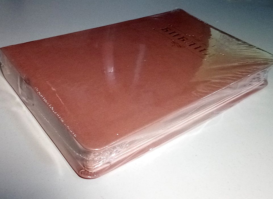 Подарочная Библия формата 143Х220 мм в гибком переплёте с обрезом «розовое золото». В издание входят только канонические книги (В Ветхом Завете - 39 книг, всего в Библии - 66 книг). Перевод Синодальный 1876 г., в традиционной редакции в новой орфографии. Вёрстка - стандартная для канонических Библий - в две колонки, со ссылками на параллельные места в среднем междуколонном пространстве, отделённом двумя вертикальными линиями вдоль колонок. В книге - две закладки-ляссе (вшитые в корешок ленточки). Бумага белая тонкая («рисовая», «библейская») ради компактности издания, просвечивает умеренно, не мешая чтению. Карты чёрно-белые.