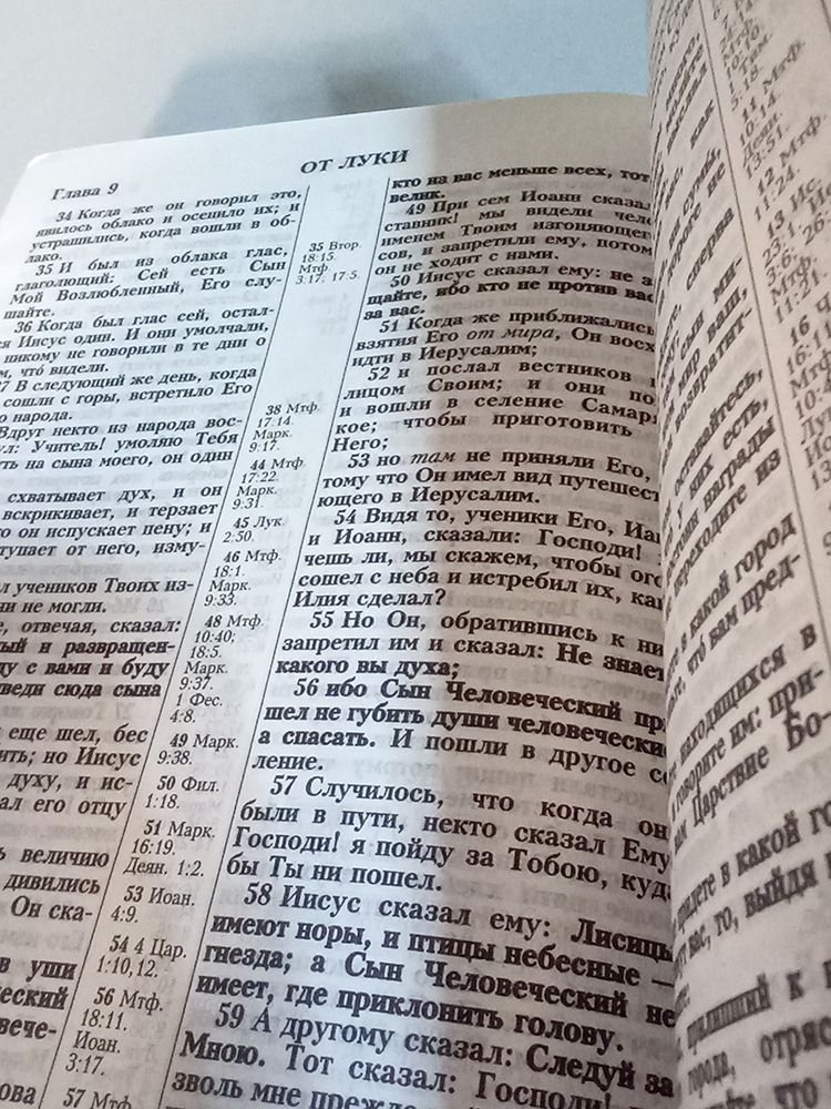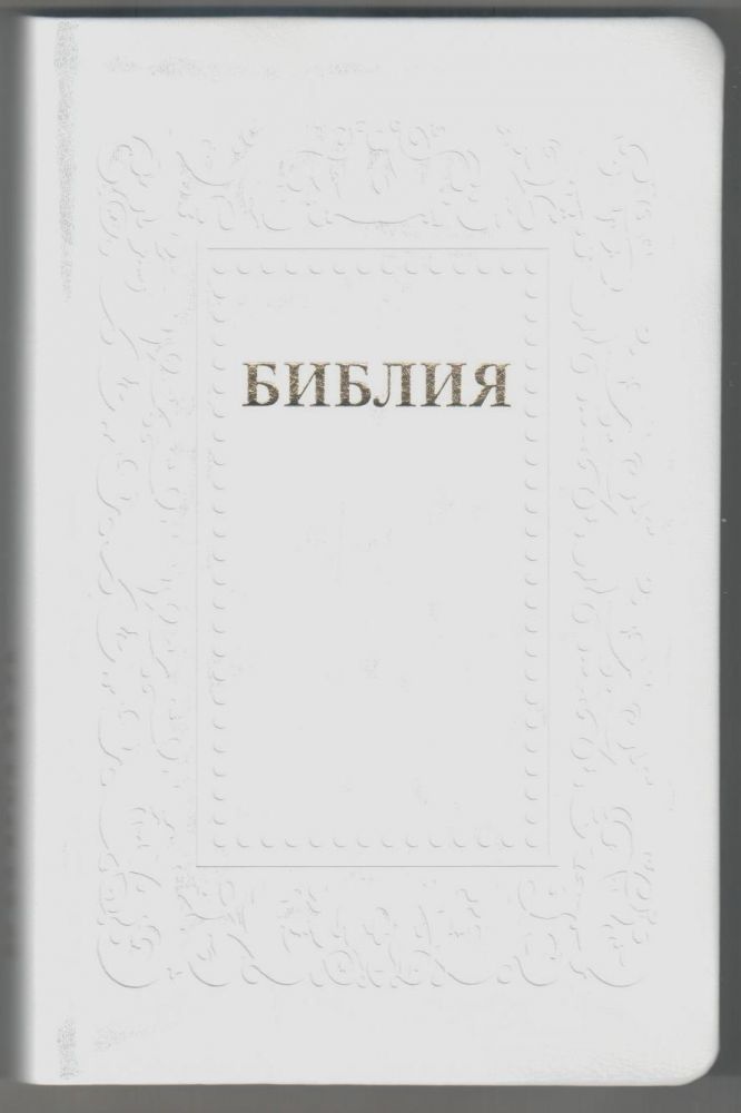 Подарочная Библия формата 143Х220 мм в гибком переплёте с золотым обрезом. Элегантность белой обложке этого издания придаёт чуть угадывающаяся (словно водяные знаки), ненавязчивая, выполненная блинтовым тиснением рамка барокко, В издание входят только канонические книги (В Ветхом Завете - 39 книг, всего в Библии - 66 книг). Перевод Синодальный 1876 г., в традиционной редакции, в новой орфографии. Вёрстка - стандартная и самая ныне распространённая для канонических синодальных Библий - в две колонки, со ссылками на параллельные места в среднем междуколонном пространстве, отделённом двумя вертикальными линиями вдоль колонок. В книге - две закладки-ляссе (вшитые в корешок ленточки). Бумага белая тонкая («рисовая», «библейская») ради компактности издания, просвечивает умеренно, не мешая чтению. Карты чёрно-белые.
