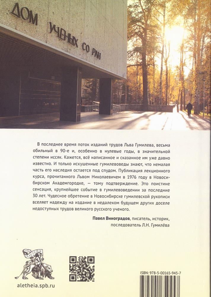 Лев Гумилев написал в общей сложности 13 книг, многократно изданных и хорошо известных почитателям его таланта. В их числе два лекционных курса — "Конец и вновь начало" и "Струна истории". О существовании еще одного гумилевоведы до недавнего времени даже не подозревали. Информация о нем всплыла в социальных сетях всего несколько лет назад. Как выяснилось, в Интегральном музее-квартире новосибирского Академгородка хранится рукопись лекций, прочитанных Львом Николаевичем в Доме ученых Академгородка в 1976 г. Благодаря усилиям Анастасии Близнюк, руководителя упомянутого музея-квартиры, а также историка-гумилевца Ивана Москвитина, они теперь доступны широкому читателю. Помимо лекций данное издание содержит воспоминания друзей и знакомых Льва Гумилева и работы его последователей, которые тоже публикуются впервые.