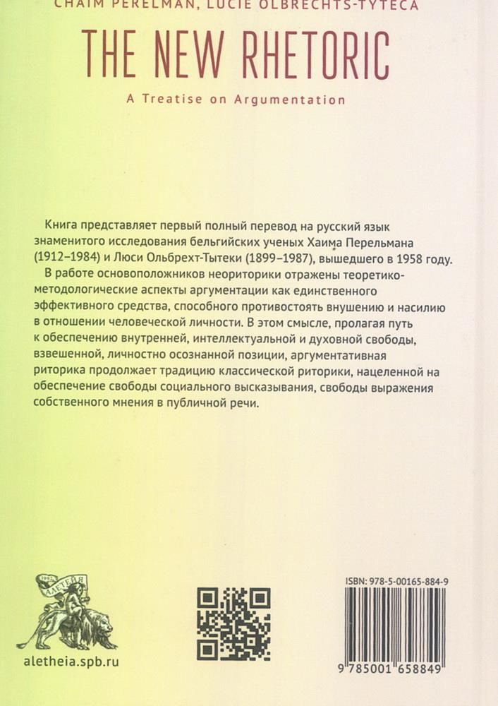Книга представляет собой первый полнотекстовый перевод на русский язык знаменитого исследования бельгийских ученых Хаима Перельмана (1912–1984) и Люси Ольбрехт-Тытеки (1899-1987), вышедшего в 1958 году. В работе основоположников неориторики отражены теоретико-методологические аспекты аргументации как единственного эффективного средства, способного противостоять внушению и насилию в отношении человеческой личности. В этом смысле, пролагая путь к обеспечению внутренней, интеллектуальной и духовной свободы, взвешенной, личностно осознанной позиции, аргументативная риторика продолжает традицию классической риторики, нацеливавшейся на обеспечение свободы социальной, свободы выражения собственного мнения в публичной речи.