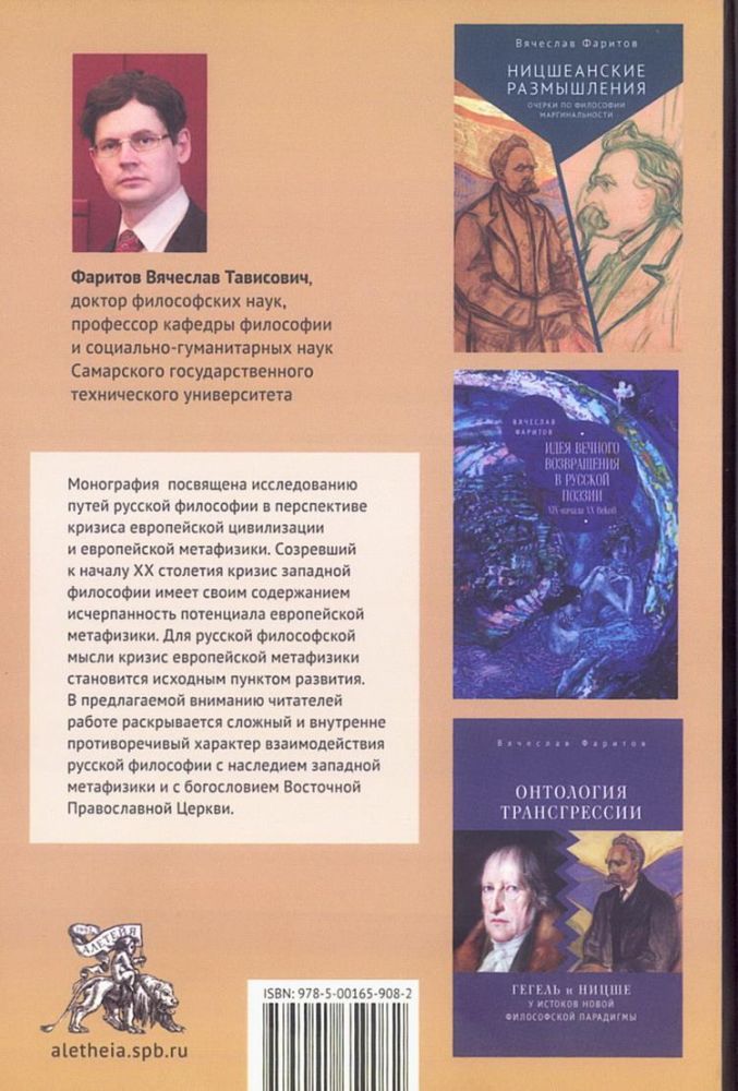 Монография посвящена исследованию путей русской философии в перспективе кризиса европейской цивилизации и европейской метафизики. Созревший к началу ХХ столетия кризис западной философии имеет своим содержанием исчерпанность потенциала европейской метафизики. Для русской философской мысли кризис европейской метафизики становится исходным пунктом развития.