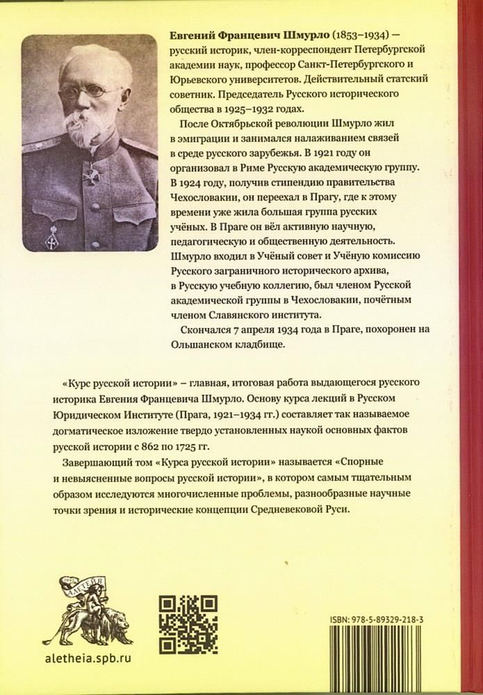 "Курс русской истории" — главная, итоговая работа выдающегося русского историка Евгения Францевича Шмурло (1853-1934). Основу курса лекций в Русском Юридическом Институте (Прага, 1921-1934 гг. ) составляет так называемое догматическое изложение твердо установленных наукой основных фактов русской истории с 862 по 1725 гг. Завершающий том "Курса русской истории" называется "Спорные и невыясненные вопросы русской истории", в котором самым тщательным образом исследуются многочисленные проблемы, разнообразные научные точки зрения и исторические концепции Средневековой Руси.