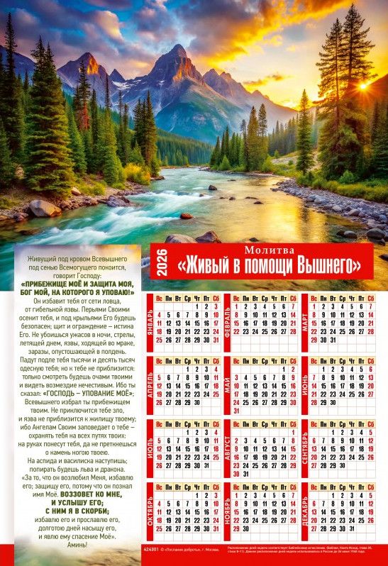Календарь настенный листовой на 2026 год с молитвой «Живый в помощи Вышнего» станет ежедневным источником духовной поддержки и защиты. Молитвенные тексты, размещенные на страницах календаря, будут оберегать вас и наполнять каждый день верой и надеждой.
