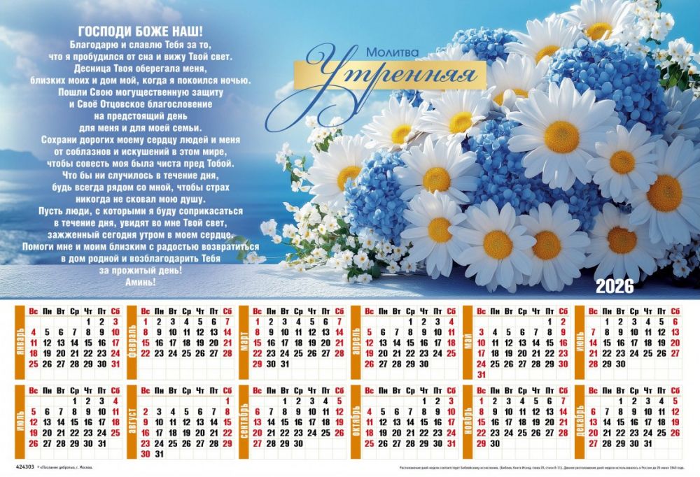 Листовой календарь "Молитва Утренняя" на 2026 год наполнит каждое утро благодарностью и светом. Слова утренней молитвы, размещенные на страницах календаря, помогут настроиться на позитивный лад, обрести душевное спокойствие и провести день под Божьим благословением.