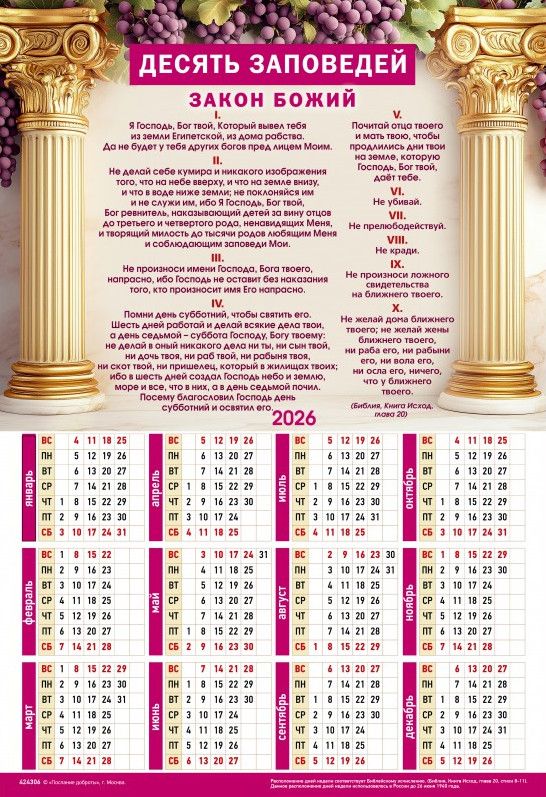 Листовой календарь "Десять Заповедей Божьих" на 2026 год напомнит о вечных нравственных принципах, данных человечеству. Слова заповедей, размещенные на страницах календаря, помогут руководствоваться мудростью Священного Писания в повседневной жизни, сохранять чистоту помыслов и следовать путем праведности в течение всего года.