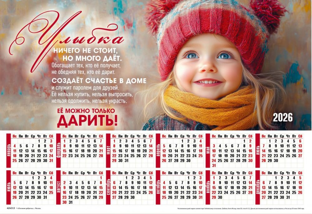 Листовой календарь "Улыбка" на 2026 год наполнит каждый день позитивом и радостью. Мудрые слова о силе улыбки и яркое изображение ребенка подарят хорошее настроение и напомнят о важности простых человеческих радостей в течение всего года.