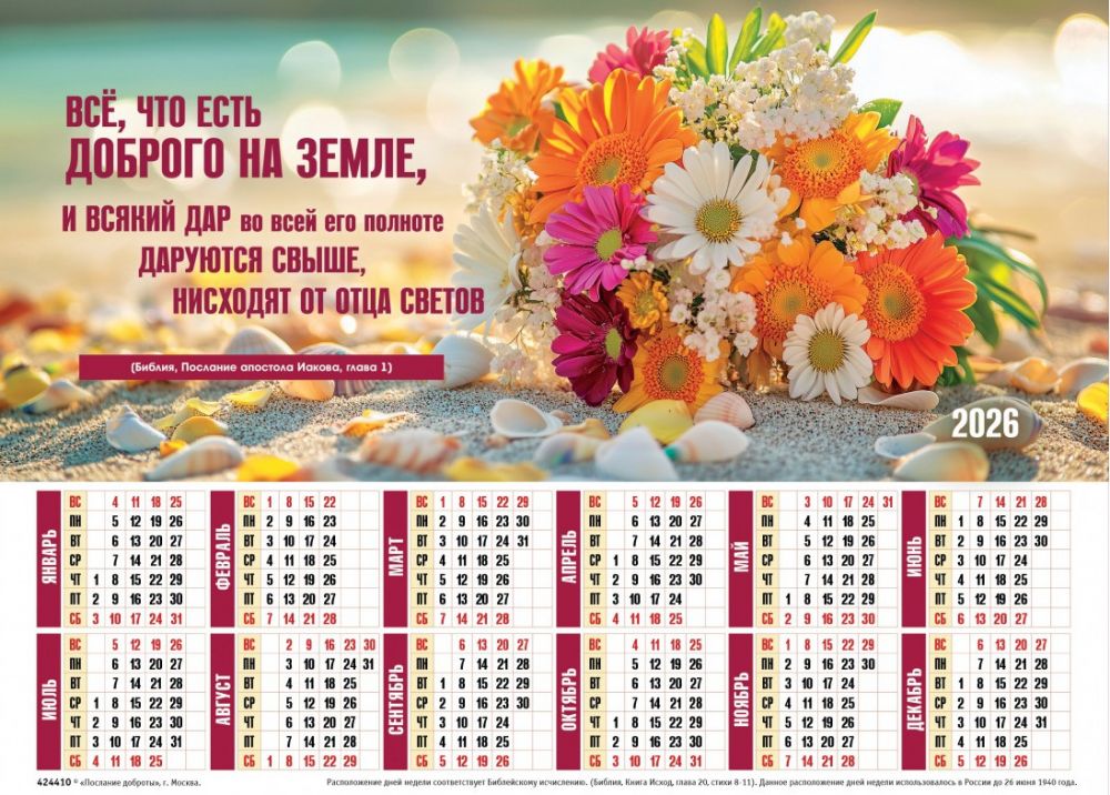 Листовой календарь "Всё, что есть доброго на земле" на 2026 год напомнит о щедрости и благости Творца. Библейские строки, размещенные на страницах календаря, будут вдохновлять видеть добро вокруг и благодарить за все дары свыше в течение всего года.