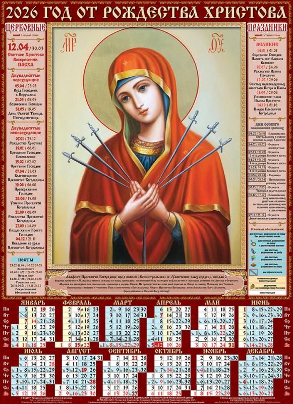 Календарь листовой православный на 2026 год «Икона Божией Матери Семистрельная»