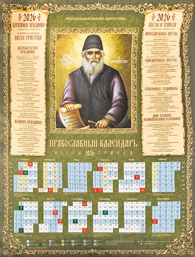 Календарь листовой православный на 2026 год «Преподобный Паисий Святогорец»