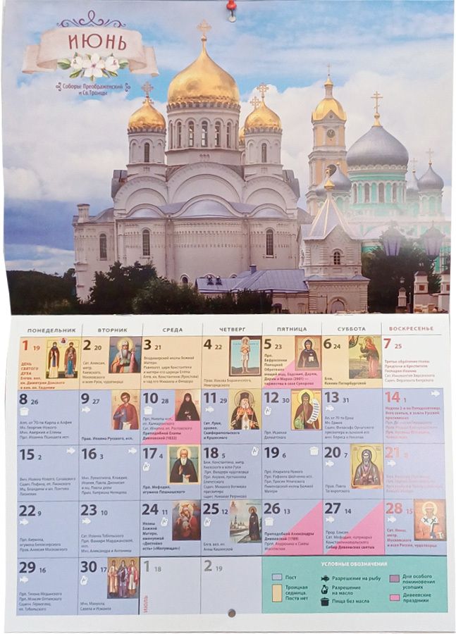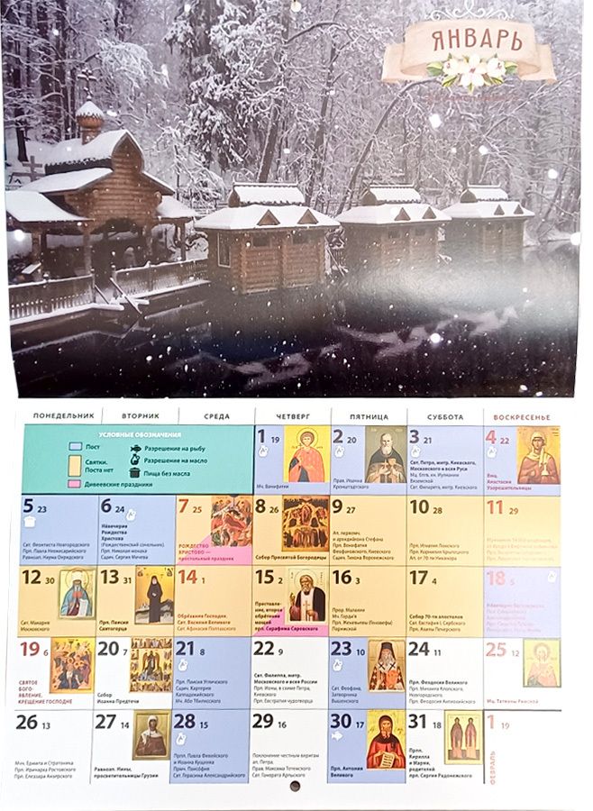 Очень красочный, настенный перекидной календарь с фотографиями Дивеево. На каждом развороте выделены праздничные дни.