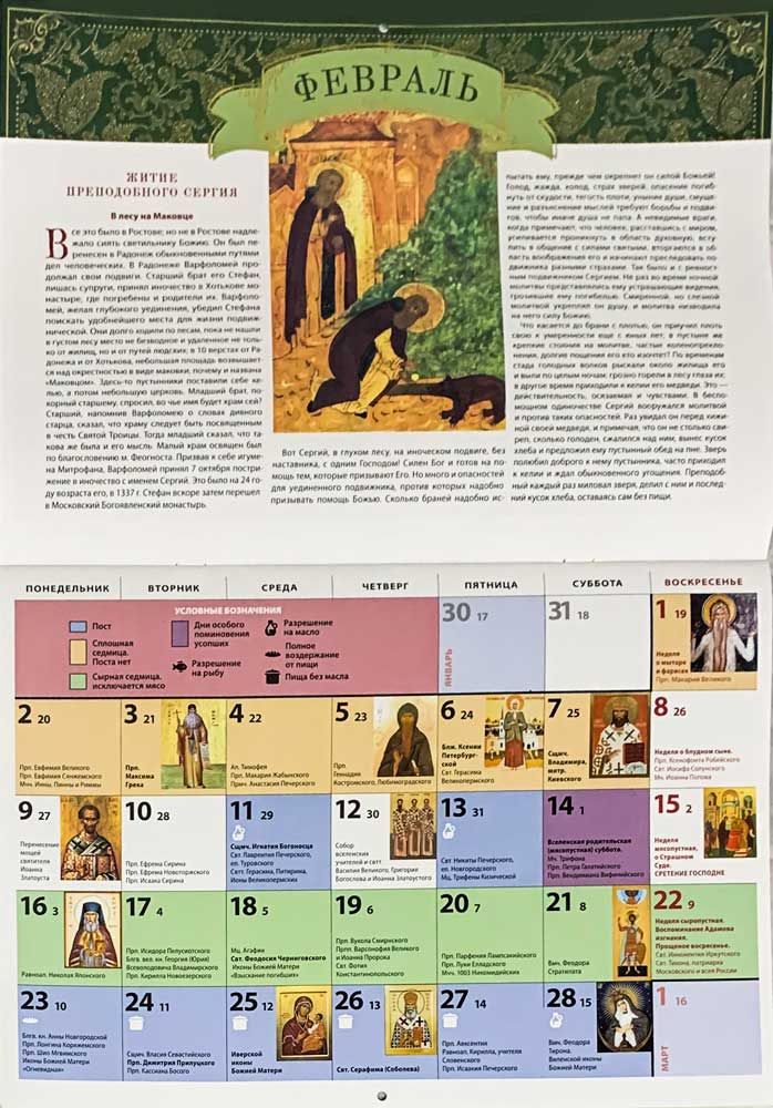 Настенный православный календарь на 2026 год — удобный и информативный помощник для верующих. Календарь посвящён преподобному Сергию Радонежскому и содержит красочное житие преподобного, хорошую и информативную календарную сетку о православных праздниках и постах.