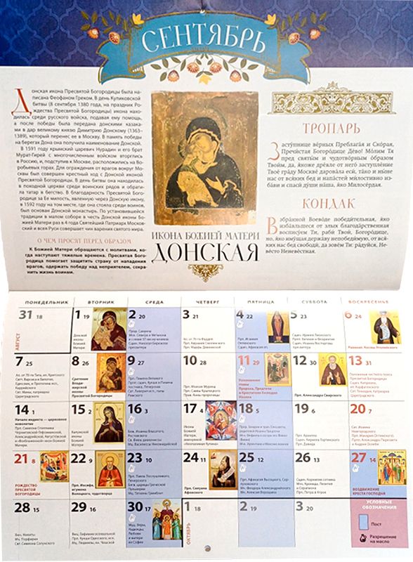 В календарной сетке указаны праздники, посты, дни особого поминовения усопших, сплошные седмицы, порядок трапезы в постные дни.
