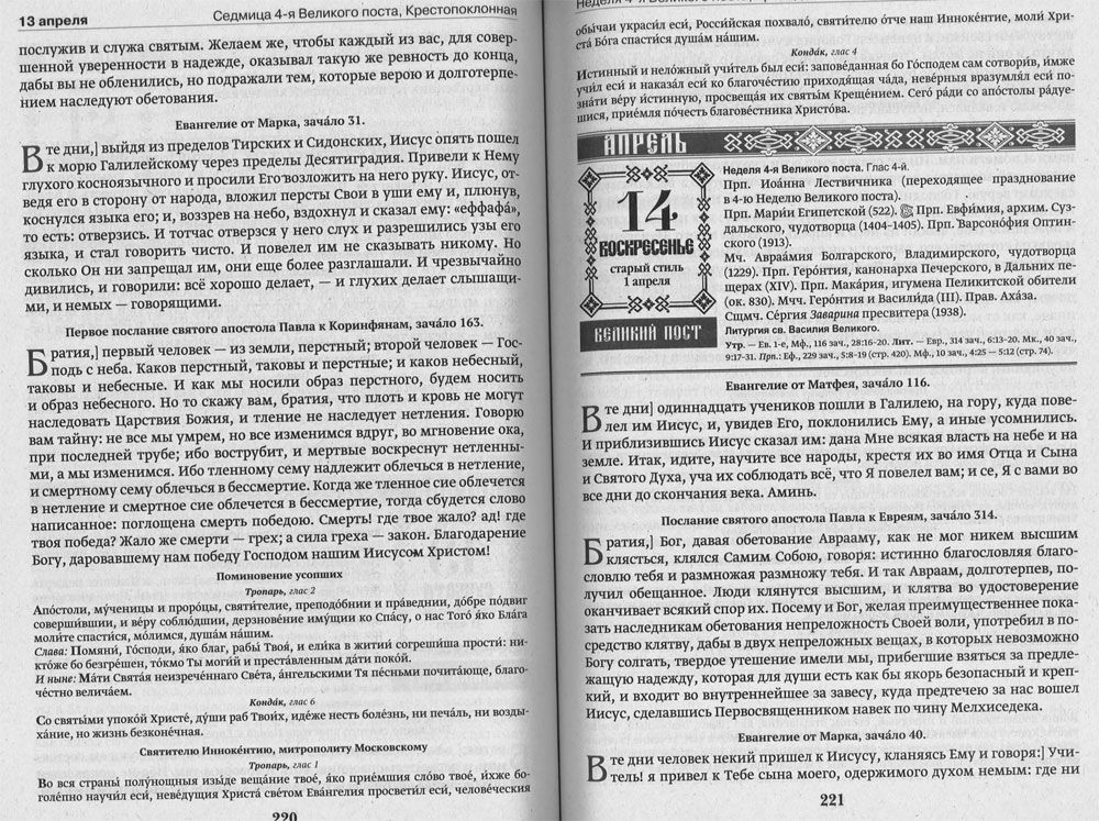Благодаря данному изданию можно не только быть в курсе важных событий церковного календарного года, но и лучше познакомиться со Священным Писанием и понять его взаимосвязь с православным богослужением. Также этот календарь поможет узнать главные богослужебные тексты Русской Православной Церкви, посвященные праздникам и святым — тропари и кондаки.