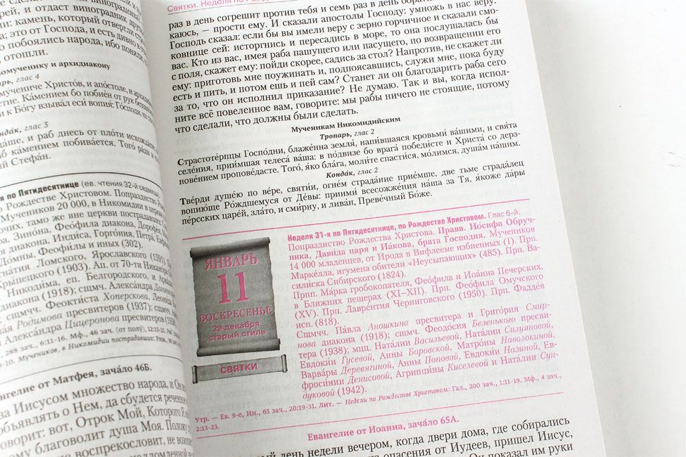 Благодаря данному изданию можно не только быть в курсе важных событий церковного календарного года, но и лучше познакомиться со Священным Писанием и понять его взаимосвязь с Православным богослужением. Также этот календарь поможет узнать главные богослужебные тексты Русской Православной церкви, посвященные праздникам и святым — тропари и кондаки.