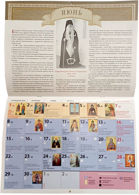Календарь посвящен старцам Псково-Печерского монастыря. На каждом развороте представлены краткие жития старцев, их изречения и наставления. Обозначены праздничные дни.
