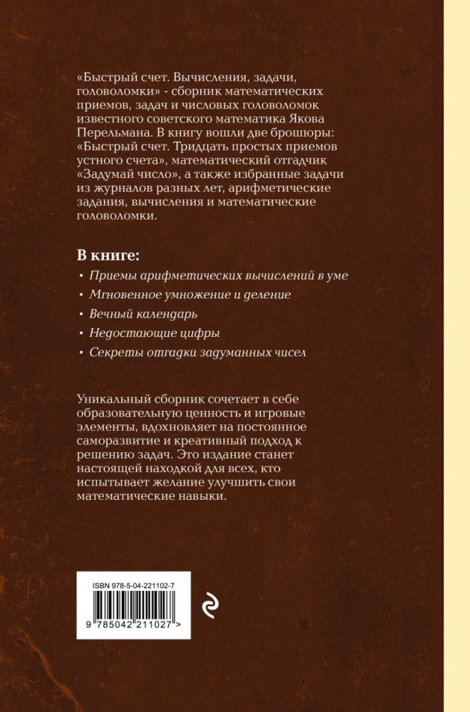 Под одной обложкой собраны: «Быстрый счет. Тридцать простых приемов устного счета», «Задумай число. Математический отгадчик», задачи Я. Перельмана из журналов разных лет, а также коллекция числовых головоломок и арифметических задач из разных сборников советского математика.