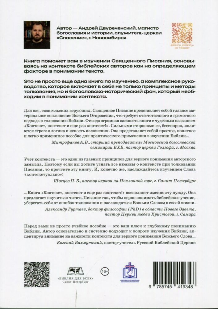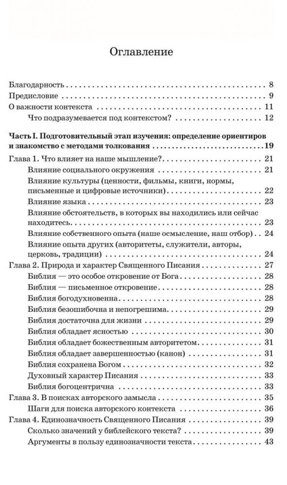 Книга предлагает научиться так читать Писание, чтобы верно понимать библейское учение, уберегаться от ошибок толкования и наслаждаться Божьим Словом. Важнейшим принципом для верного понимания текста является учет контекста. Именно о библейском контексте и говорит автор, подробно и всесторонне разбирая тему.