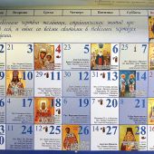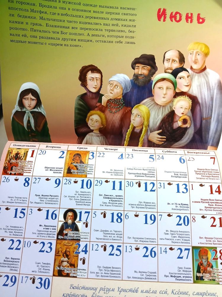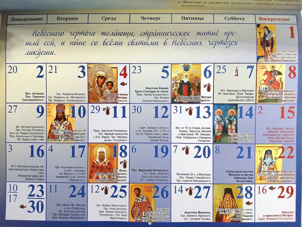 Календарная сетка с указанием постов, првославных праздников и дней почитания святых.