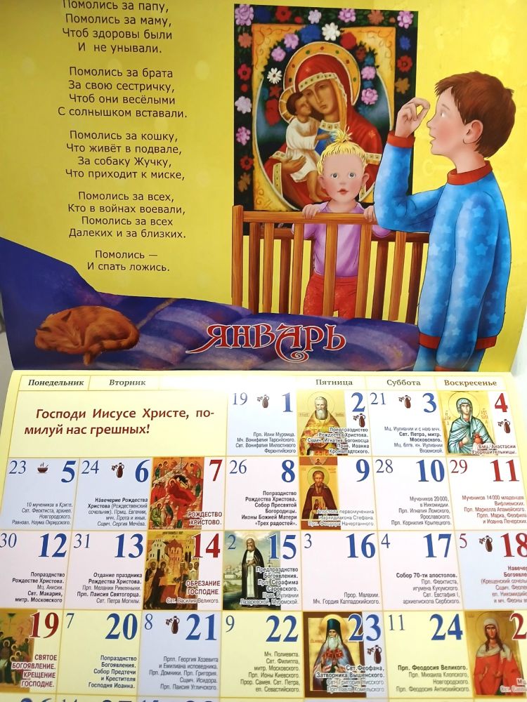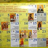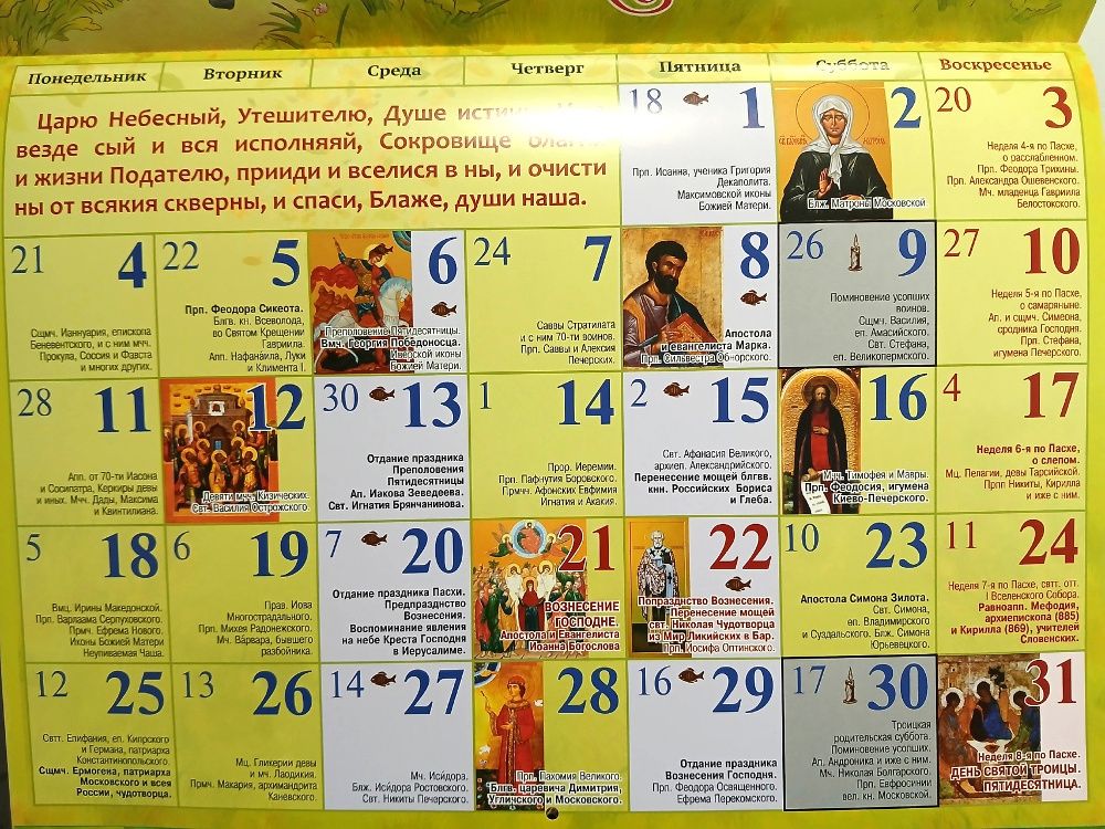 Календарная сетка с указанием постов, првославных праздников и дней почитания святых.