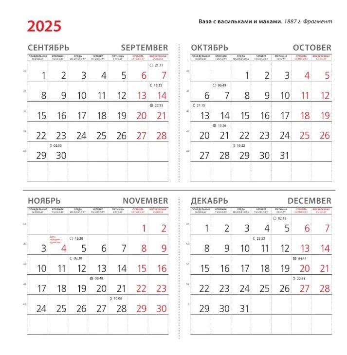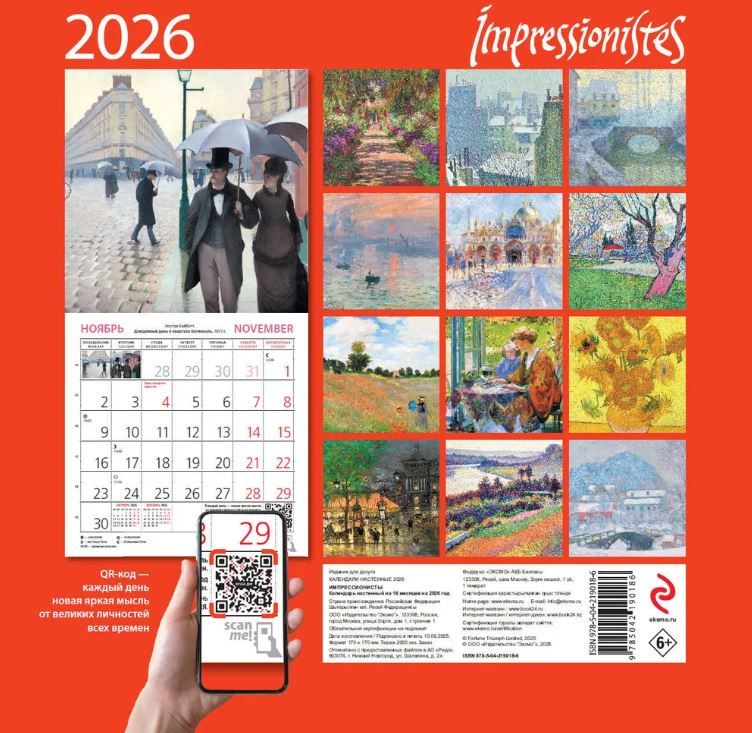 В этом настенном перекидном календаре на 2026 год представлены знаменитые картины великих художников. Повесьте этот календарь в своем доме или на рабочем месте, и он достойно украсит любой интерьер. А календарный блок напомнит о важных событиях года. Тщательно подобранные иллюстрации, напечатанные на глянцевой бумаге высочайшего качества, станут настоящим украшением дома, а в календарной сетке найдется место для ваших планов: большие клетки позволят делать записи и организовать свой год! В календаре также отмечены все государственные праздники.