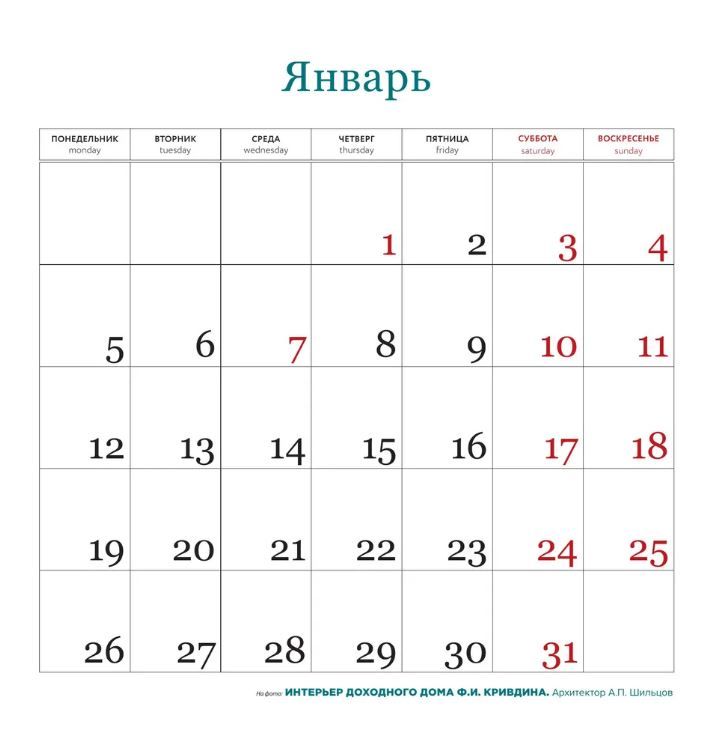 Тщательно подобранные иллюстрации, напечатанные на глянцевой бумаге высочайшего качества, станут настоящим украшением дома, а в календарной сетке найдется место для ваших планов: большие клетки позволят делать записи и организовать свой год! В календаре также отмечены все государственные праздники.