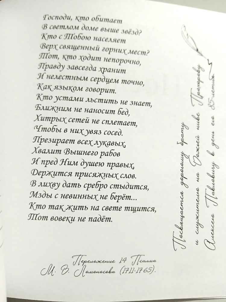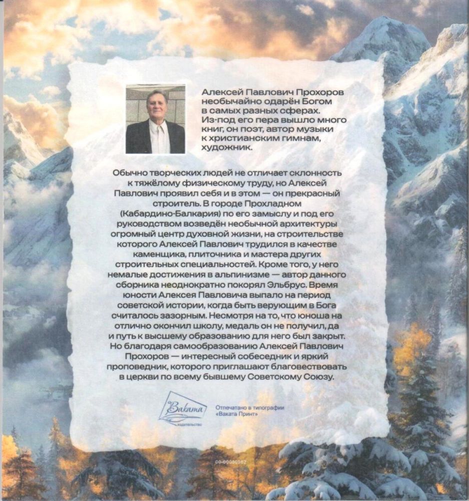руководством возведён необычной архитектуры огромный центр духовной жизни, на строительстве которого Алексей Павлович трудился в качестве каменщика, плиточника и мастера других строительных специальностей. Кроме того, у него немалые достижения в альпинизме — автор данного сборника неоднократно покорял Эльбрус. Время юности Алексея Павловича выпало на период советской истории, когда быть верующим в Бога считалось зазорным. Несмотря на то, что юноша на отлично окончил школу, медаль он не получил, да и путь к высшему образованию для него был закрыт. Но благодаря самообразованию Алексей Павлович Прохоров — интересный собеседник и яркий проповедник, которого приглашают благовествовать в церкви по всему бывшему Советскому Союзу.